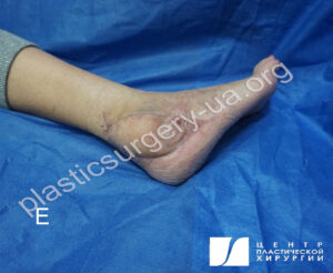 Рис. 5. Клинический случай 1. А- раневой дефект с обнажением пяточной кости и металлоконструкциями, Б – Разметка SCIP лоскута, В – Диссекция глубокой ветви при формировании лоскута, Г – Свободный SCIP лоскут, Д – Лоскут адаптированный к ране, Е – Результат реконструкции через 3 месяца.