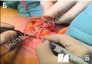 Выполнив пинч-тест, мы определяем возможную ширину лоскута, которая позволит зашить донорскую зону первичным швом. В среднем такая ширина составляет 8 см. Диссекция лоскута начинается с разреза по нижне-латеральному краяю лоскута, при этом ассистент производит легкую тракцию кожи вверх, что позволяет легко визуализировать поверхностную фасцию. Дальнейшее поднятие лоскута производится на уровне поверхностной фасции от латерального края в медиальном направлении до обнаружения латерального перфоранта глубокой ветви артерии огибающей подвздошную кость. Далее поднятие лоскута проводится в медиальной части в направлении вверх до обнаружения медиального перфоранта от поверхностной ветви. Выделив латеральный и медиальный перфорант производится их оценка и выбор наиболее надежного, с более сильной пульсацией. Менее подходящий перфорант клипируется и производится поднятие оставшегося лоскута вокруг выбранного перфоранта. Диссекция выбранного перфоранта продолжается вглубь, ниже поверхностной фасции, а затем и ниже глубокой фасции до достижения необходимой длины и калибра сосудов.