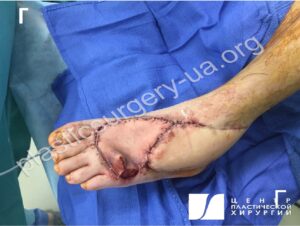 Мужчина 25 лет, с нестабильным рубцовым массивом на тыле стопы. Ранее 1 года назад пациент был прооперирован по поводу механической травмы стопы, размером 10х15 см, была выполнена реконструкция с применением сурального лоскута. Однако в связи с большой площадью раневого дефекта и частичной гибелью сурального лоскута, часть раны была закрыта с помощью кожного трансплантата. В результате на тыле стопы сформировался рубцовый массив 4х6 см, который легко травмировался и доставлял пациенту дискомфорт (Рис. 7). После иссечения рубцового массива образовавшийся дефект был закрыт с помощью тонкого SCIP лоскута, сформированного на поверхностной ветви, на уровне поверхностной фасции. Лоскут был подключен к кровотоку наложением анастомозов конец в конец к артерии и вене тыла стопы. Для предупреждения излишнего натяжения лоскута, часть лоскута не была подшита к краям раны, дополнительные швы были наложены через 2 недели, после полной адаптации лоскута. Послеоперационный период прошел без осложнений, был сформирован износостойкий кожный покров тыла стопы.