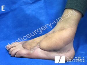 Рис. 7. Клинический случай 2. а. Стопа с пересаженным ранее суральным лоскутом и рубцовым массивом дистальнее лоскута, б. Этап выделения диссекции сосудистой ножки, в. Отделенный свободный SCIP лоскут, г. пересаженный лоскут в область раневого дефекта после удаления рубцового массива, часть лоскута не подшита к краю раны для предотвращения излишнего натяжения, д. Лоскут через 14 дней после пересадки, наложены дополнительный швы, е. Результат лечения через 2 года.