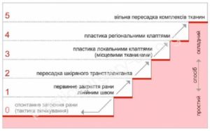 оперативних втручань з приводу дефектів шкіри голови [5,6]. Зокрема для невеликих дефектів рекомендовано використовувати первинне їх закриття. Якщо закриття рани первинним швом неможливе, то застосовують інші методи реконструкції шкірного покриву та м’яких тканин з використанням місцевих, регіональних або віддалених донорських ресурсів тканин [4‒6]: переміщення шкірних клаптів на живлячій ніжці, експандерну дермотензію, пересадку розщепленого шкірного графта, етапну пластику стеблиною та вільну пересадку комплексів тканин із застосуванням мікрохірургічної техніки. Вибір оптимального методу пластики від простого (з низьким ризиком післяопераційних ускладнень) до складного (з високим ризиком ускладнень) здійснюють за принципом «реконструктивних щаблів» (Рис. 1) [7].