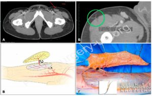 поверхні стегна, які можуть бути використані як живляча ніжка острівцевого клаптя; Б – комп’ютернотомографічне дослідження з ангіографією перфорантів передньої поверхні стегна, зеленим колом обведено обраний домінантний перфорант для живлячої ніжки ALT-клаптя; В – схема забору ALT-клаптя на передній поверхні стегна (1 – низхідна гілка латеральної артерії, котра огинає стегнову кістку; 2 – шкірний перфорант низхідної гілки, котра формує живлячу ніжку ALT-клаптя); Г – інтраопераційне фото