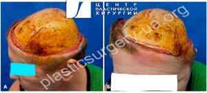 Рис. 5. Етапи лікування великої скальпованої рани голови з оголенням кісток склепіння черепа: А – вигляд рани на момент госпіталізації в клініку; Б – вигляд рани склепіння черепа після повного відновлення шкірного покриву (через 8 міс після виписки)