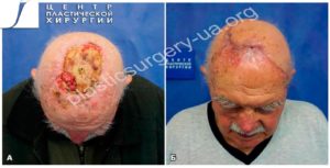 Пацієнт К., 82 роки. За 1,5 року до госпіталізації в Центр термічної травми та пластичної хірургії пацієнта прооперовано з приводу карциноми волосяної частини голови. Утворився дефект шкіри діаметром до