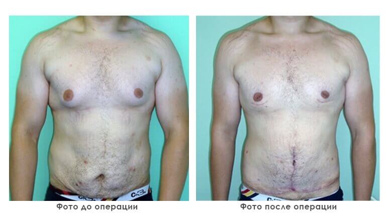 Гінекомастія. Після різкого схуднення (на 40 кг протягом року) сформувався птоз м’яких тканин передньої черевної стінки, бічних поверхонь тулуба. Зроблено абдомінопластику з дермоліпектомією та усунення гінекомастії відкритим методом.