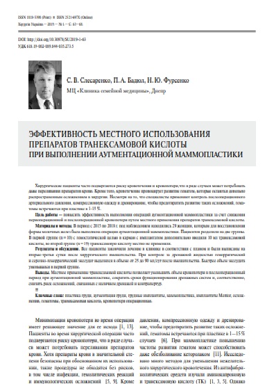 ЭФФЕКТИВНОСТЬ МЕСТНОГО ИСПОЛЬЗОВАНИЯ ПРЕПАРАТОВ ТРАНЕКСАМОВОЙ КИСЛОТЫ ПРИ ВЫПОЛНЕНИИ АУГМЕНТАЦИОННОЙ МАММОПЛАСТИКИ С. В. Слесаренко, П. А. Бадюл, Н. Ю. Фурсенко МЦ «Клиника семейной медицины», Днепр Хирургические пациенты часто подвергаются риску кровотечения …
