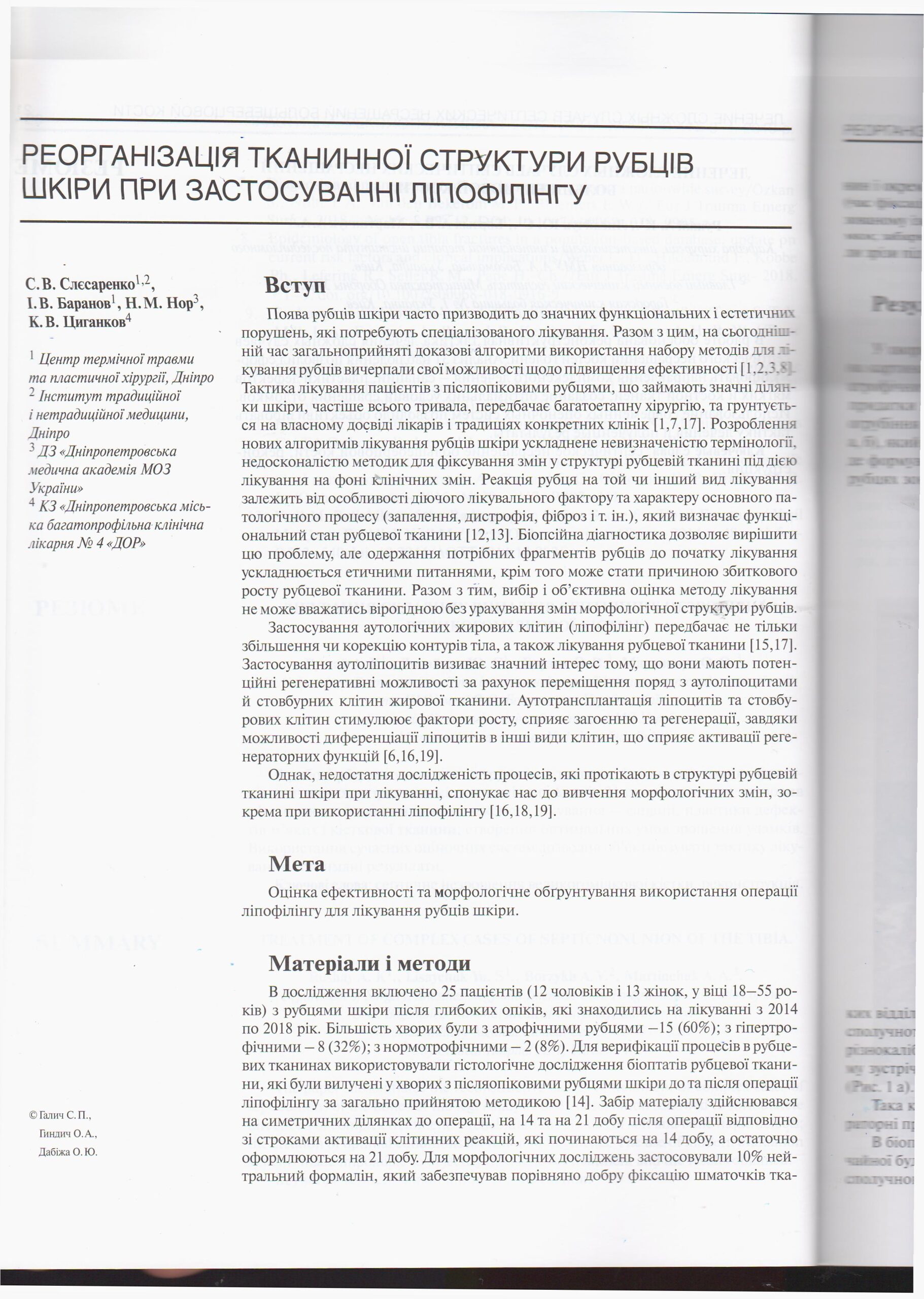 РЕОРГАНІЗАЦІЯ ТКАНИННОЇ СТРУКТУРИ РУБЦІВ ШКІРИ ПРИ ЗАСТОСУВАННІ ЛІПОФІЛІНГУ С.В.Слєсаренко1,2, І.В. Баранов1, Н.М.Нор3, К.В. Циганков4 1. Центр термічної травми та пластичної хірургії, Дніпро 2. Інститут традиційної і нетрадиційної медицини, Дніпро 3. …