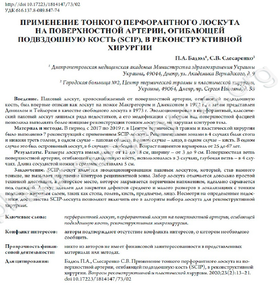 УДК:616:089.844:616.5.004.64 ПРИМЕНЕНИЕ ТОНКОГО ПЕРФОРАНТНОГО ЛОСКУТА НА ПОВЕРХНОСТНОЙ АРТЕРИИ, ОГИБАЮЩЕЙ ПОДВЗДОШНУЮ КОСТЬ (SCIP), В РЕКОНСТРУКТИВНОЙ ХИРУРГИИ П.А. Бадюл (1), С.В. Слесаренко (2) 1 Днепропетровская медицинская академия Министерства здравоохранения Украины, Украина, 49044, Днепр, ул. Академика Вернадского, д. 9 2 Городская больница №2, Центр термической травмы и пластической хирургии, Украина, 49064, Днепр, пр. Сергея Нигояна, д. 53 Введение. Паховый лоскут, кровоснабжаемый от поверхностной артерии, огибающей подвздошную кость, был впервые описан как лоскут на ножке Макгрегором и Джексоном в 1972 г., …