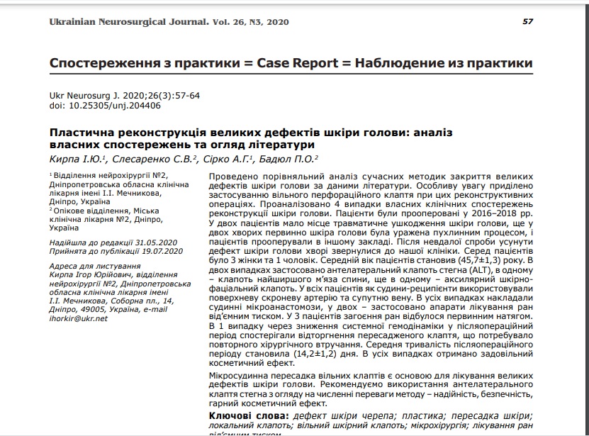 Пластична реконструкція великих дефектів шкіри голови: аналіз власних спостережень та огляд літератури Кирпа І.Ю.1, Слесаренко С.В.2, Сірко А.Г.1, Бадюл П.О.2 Ukr Neurosurg J. 2020;26(3):57-64 doi: 10.25305/unj.204406 1 Відділення нейрохірургії №2, Дніпропетровська обласна клінічна лікарня імені І.І. Мечникова, Дніпро, Україна 2 Опікове відділення, Міська клінічна лікарня …