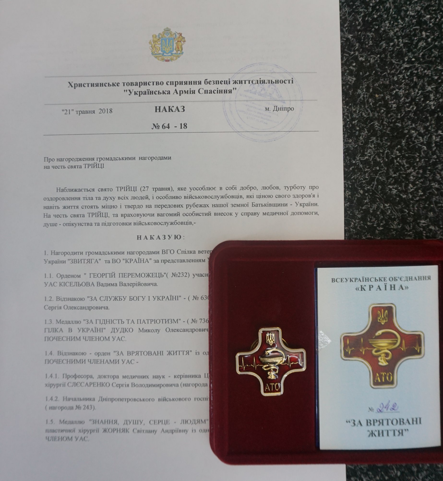 Наши хирурги получили награды от Христианского общества содействия безопасности жизнедеятельности “Украинская Армия Спасения”, 21 мая 2018г